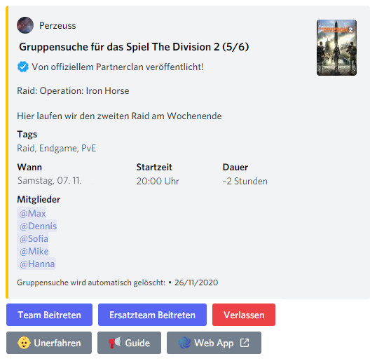 Als Partner-Clan, erhaltet Ihr kostenlosen Zugriff auf unseren Bot, mit dem man Gruppensuchen organisieren kann. Ihr könnt diesen Bot nutzen, um clan-interne Aktivitäten zu planen.